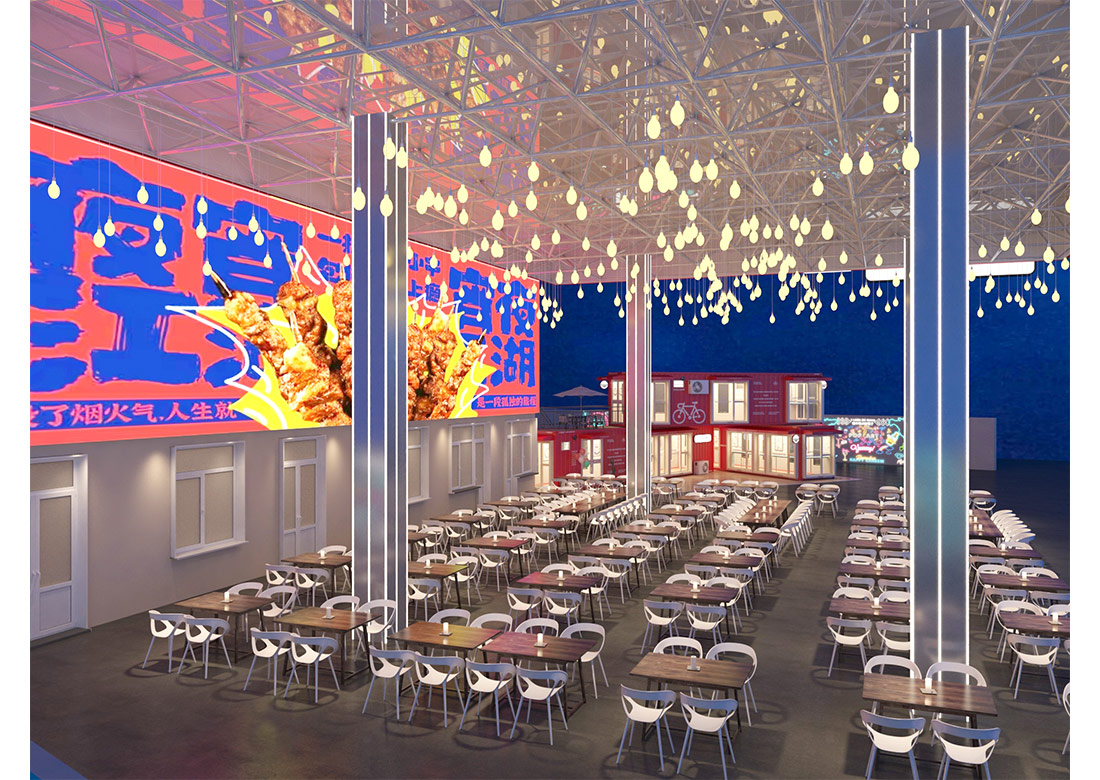 設計理念: 集裝箱大排檔裝修效果圖展現出了各種元素相互碰撞從而打造出完美融合。在總體布局上來說采用了集裝箱的利用和加油站的輪廓,再經過精美的裝飾,該濟南店面裝修能激發了顧客們的消費興趣與獨特的審美觀點。在墻面上掛上每家小吃的精美照片,為大排檔吸引來更多的人群。