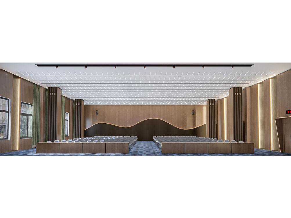 設計理念: 作為濟南辦公室裝修中大型功能空間的代表,該大堂報告廳以沉穩木飾面 + 金屬線條鋪陳基調,頂部穿孔吊頂搭配嵌入式燈光,兼顧聲學與視覺通透感。巨幅電子屏 + 對稱音響設備適配會議、匯報需求,米色座椅與紅色臺階營造莊重又舒適的氛圍,是濟南辦公室裝修中高規格功能空間的典型設計。